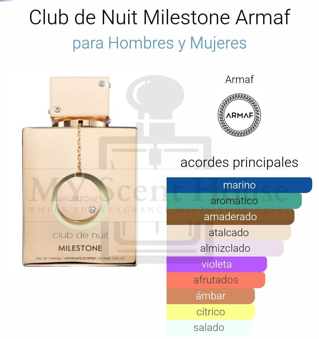 Club de Nuit Milestone by Armaf is a Woody Floral Musk fragrance for women and men. Club de Nuit Milestone was launched in 2019. Top notes are Sea Notes, Red Fruits and Bergamot; middle notes are Violet, White Woods and Sandalwood; base notes are Musk, Ambroxan and Vetiver.