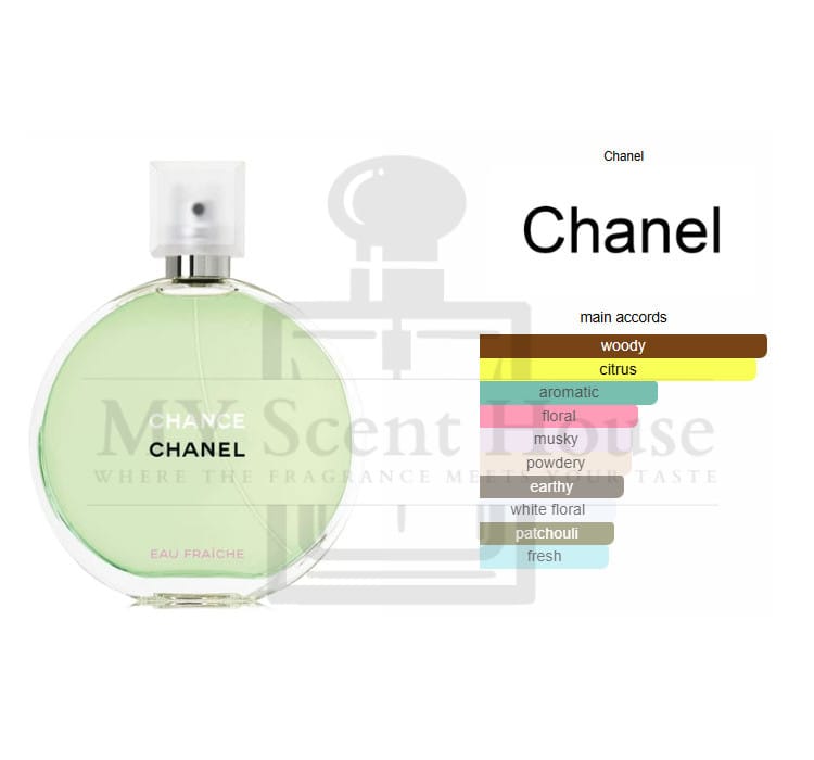Chance Eau Fraiche by Chanel is a Chypre Floral fragrance for women. Chance Eau Fraiche was launched in 2007. The nose behind this fragrance is Jacques Polge. Top notes are Lemon, Cedar and Citron; middle notes are Water Hyacinth, Pink Pepper and Jasmine; base notes are White Musk, Patchouli, Vetiver, Teak Wood, Iris and Amber.