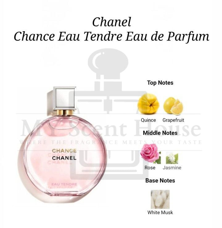 Chance Eau Tendre by Chanel is a Floral Fruity fragrance for women. Chance Eau Tendre was launched in 2010. The nose behind this fragrance is Jacques Polge. Top notes are Quince and Grapefruit; middle notes are Hyacinth and Jasmine; base notes are Musk, Iris, Virginia Cedar and Amber.