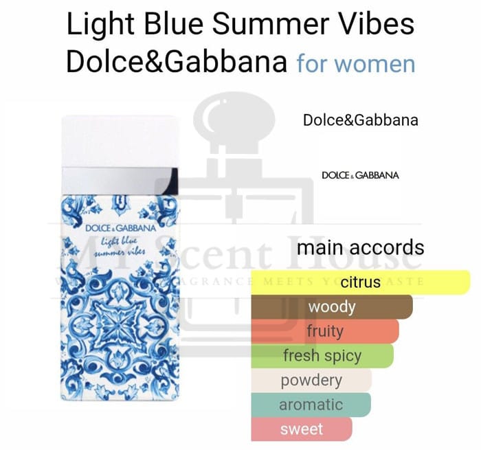 Light Blue Summer Vibes by Dolce&Gabbana is a Floral Woody Musk fragrance for women. This is a new fragrance. Light Blue Summer Vibes was launched in 2023. The nose behind this fragrance is Olivier Cresp. Top note is Calabrian bergamot; middle note is Peach; base note is Cedar.