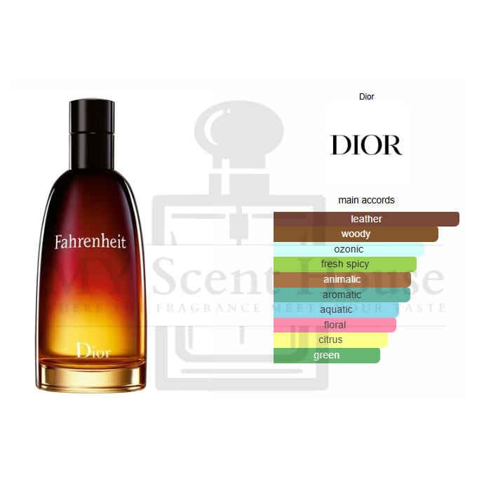 Fahrenheit by Dior is a Aromatic Fougere fragrance for men. Fahrenheit was launched in 1988. Fahrenheit was created by Jean-Louis Sieuzac, Michel Almairac and Maurice Roger. Top notes are Nutmeg Flower, Lavender, Cedar, Mandarin Orange, Chamomile, Hawthorn, Bergamot and Lemon; middle notes are Violet Leaf, Nutmeg, Cedar, Sandalwood, Carnation, Honeysuckle, Jasmine and Lily-of-the-Valley; base notes are Leather, Vetiver, Musk, Amber, Patchouli and Tonka Bean