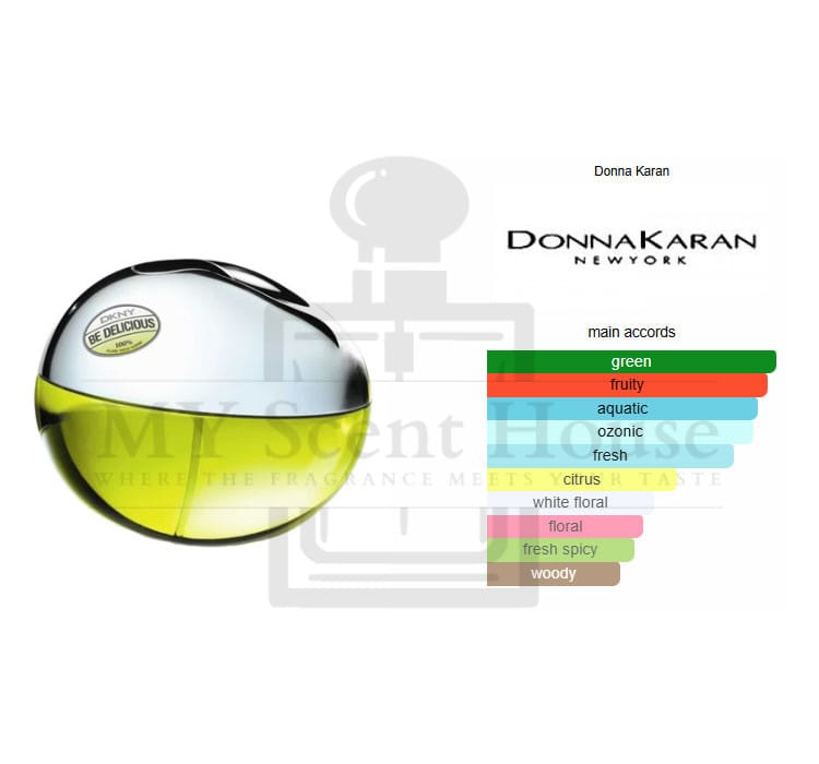 DKNY Be Delicious by Donna Karan is a Floral Fruity fragrance for women. DKNY Be Delicious was launched in 2004. The nose behind this fragrance is Maurice Roucel. Top notes are Cucumber, Grapefruit and Magnolia; middle notes are Green Apple, Lily-of-the-Valley, Tuberose, Violet and Rose; base notes are Woodsy Notes, Sandalwood and Amber.