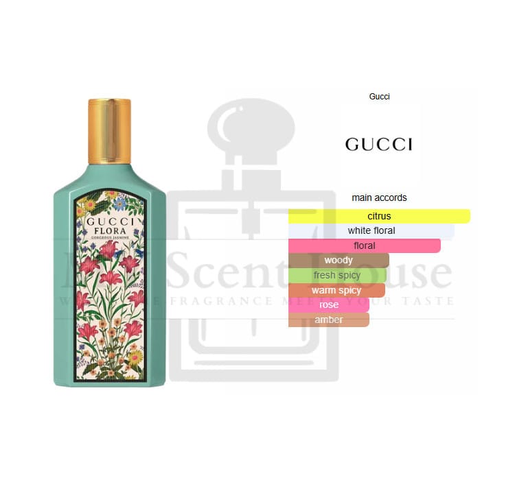 Flora Gorgeous Jasmine by Gucci is a Floral fragrance for women. This is a new fragrance. Flora Gorgeous Jasmine was launched in 2022. The nose behind this fragrance is Alberto Morillas. Top notes are Italian Mandarin, Bergamot and Black Pepper; middle notes are Jasmine, Jasmine Sambac, Magnolia and Damask Rose; base notes are Australian Sandalwood, Benzoin and Patchouli.