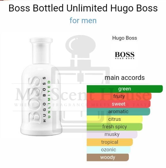 Boss Bottled Unlimited by Hugo Boss is a Aromatic Fougere fragrance for men. Boss Bottled Unlimited was launched in 2014. Top notes are Mint, Grapefruit and Violet Leaf; middle notes are Pineapple, Rose and Cinnamon; base notes are White Musk, Labdanum and Sandalwood.Hugo Boss Bottled Unlimited