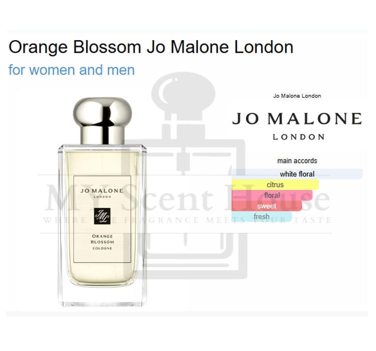 Orange Blossom by Jo Malone London is a Floral fragrance for women and men. Orange Blossom was launched in 2003. The nose behind this fragrance is Jean Claude Delville. Top note is Tangerine Blossom; middle notes are Orange Blossom, Lilac and Water Lily; base notes are Iris and Vetiver.
