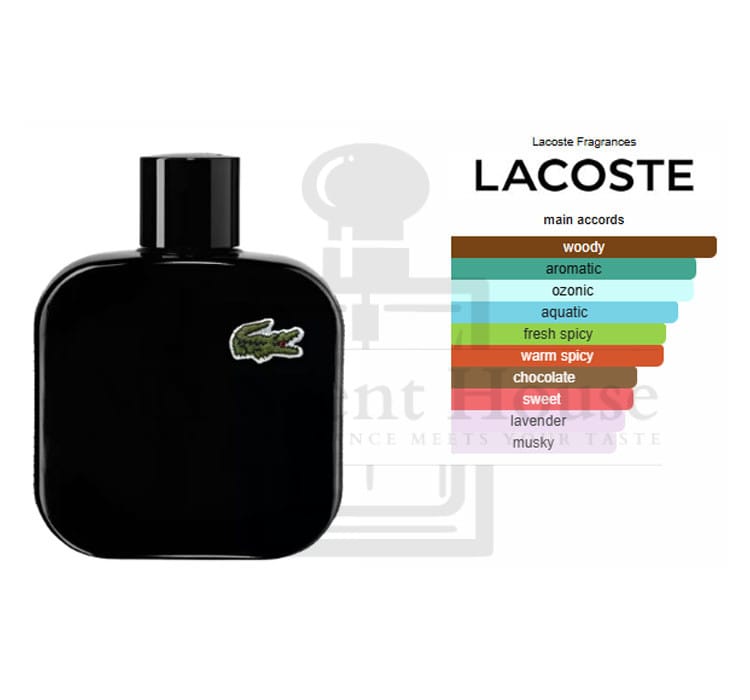 Lacoste L.12.12. Noir Intense by Lacoste Fragrances is a Woody Aromatic fragrance for men. Eau de Lacoste L.12.12. Noir was launched in 2013. Top note is Watermelon; middle notes are Basil, Lavender and Verbena; base notes are Dark Chocolate, Cashmeran, Patchouli and Coumarin.