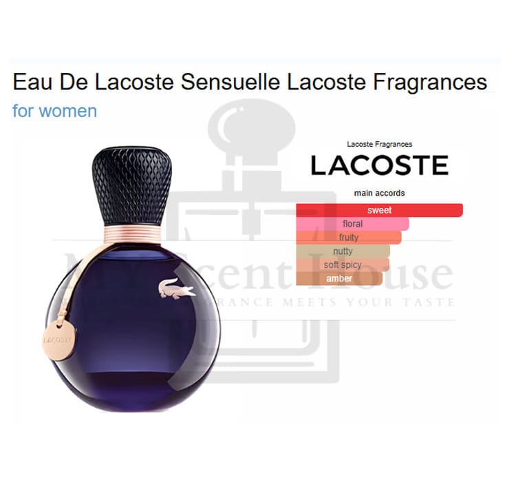 Eau De Lacoste Sensuelle by Lacoste Fragrances is a fragrance for women. Eau De Lacoste Sensuelle was launched in 2013. Top notes are Black Currant and Pink Pepper; middle notes are Sweet Pea, Gladiolus and Turkish Rose; base notes are Nougat and Amber.
