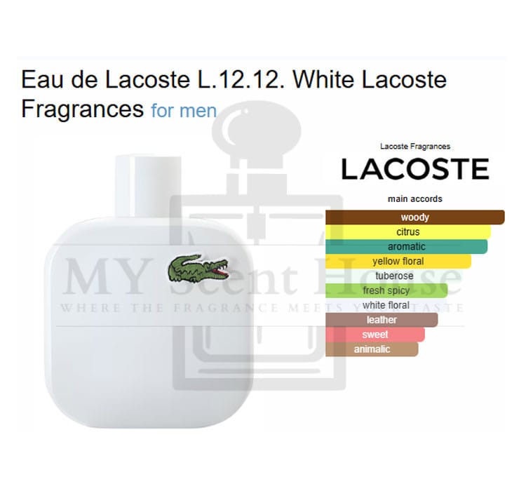 Eau de Lacoste L.12.12. White by Lacoste Fragrances is a Woody Aromatic fragrance for men. Eau de Lacoste L.12.12. White was launched in 2011. Top notes are Grapefruit, Rosemary and Cardamom; middle notes are Ylang-Ylang and Tuberose; base notes are Virginia Cedar, Suede, Vetiver and Leather.