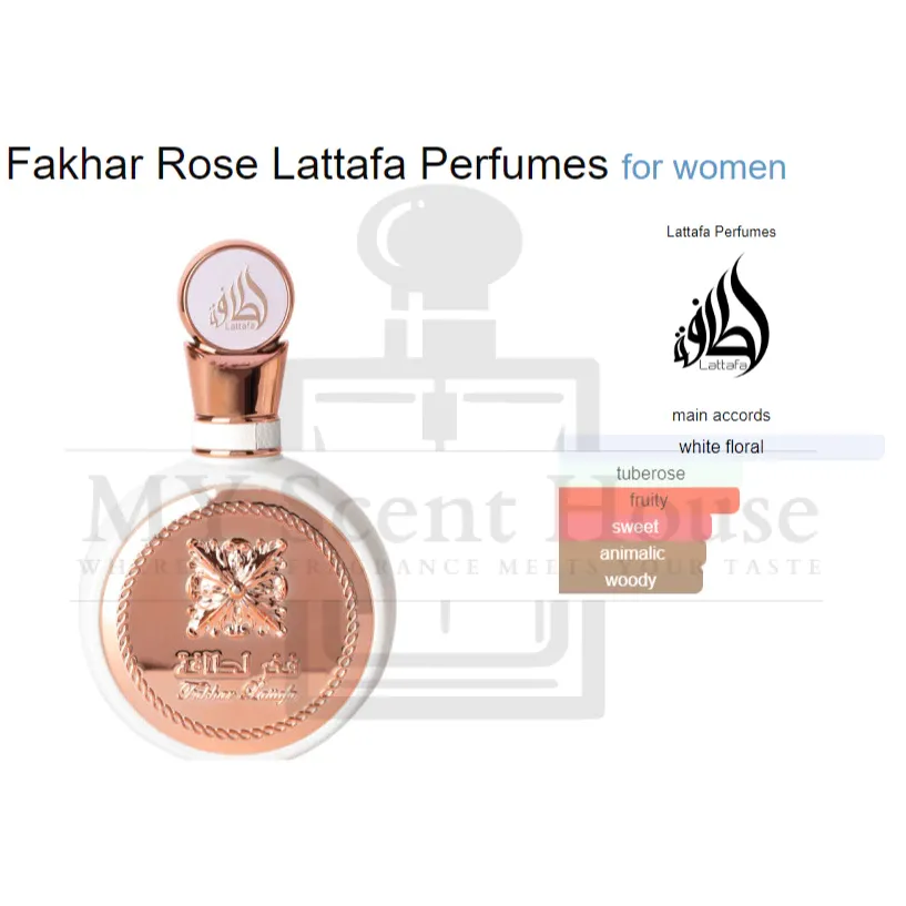 Fakhar Rose by Lattafa Perfumes is a Floral fragrance for women. This is a new fragrance. Fakhar Rose was launched in 2022. Top notes are Fruits, Lily, Pomegranate and Aldehydes; middle notes are Tuberose, Jasmine, Gardenia, Ylang-Ylang, Honeysuckle, Rose and Peony; base notes are Vanilla, White Musk, Sandalwood and Ambroxan.
