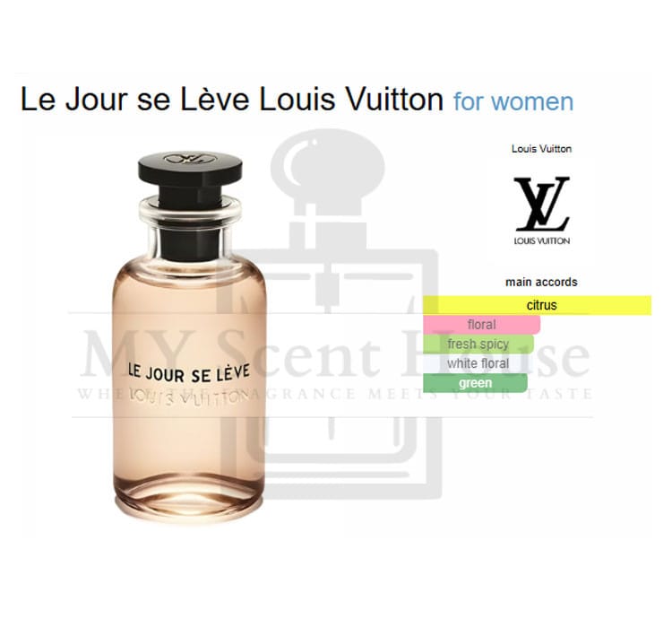 Le Jour se Lève by Louis Vuitton is a Floral Fruity fragrance for women. Le Jour se Lève was launched in 2018. The nose behind this fragrance is Jacques Cavallier Belletrud. Top notes are Grapefruit, Mandarin Orange, Orange, Bergamot and Black Currant; middle notes are Lily-of-the-Valley, Jasmine Sambac, Green Notes, Osmanthus, Magnolia, Peony and Rose; base notes are White Musk, Iso E Super, Vanillin and Vanilla.