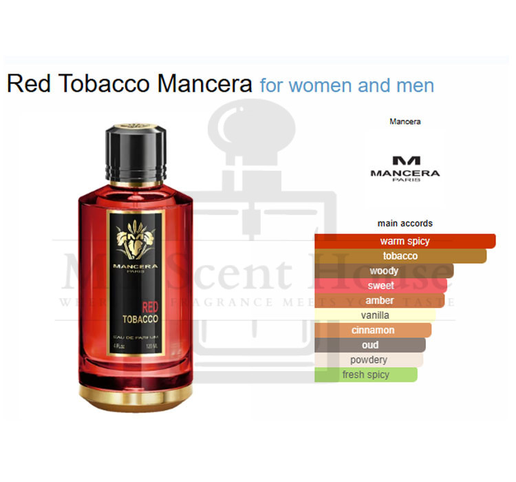 Red Tobacco by Mancera is a Woody Spicy fragrance for women and men. Red Tobacco was launched in 2017. The nose behind this fragrance is Pierre Montale. Top notes are Cinnamon, Agarwood (Oud), Incense, Saffron, Nutmeg, Green Apple and White Pear; middle notes are Patchouli and Jasmine; base notes are Tobacco, Madagascar Vanilla, Amber, Sandalwood, Guaiac Wood, White Musk and Haitian Vetiver.