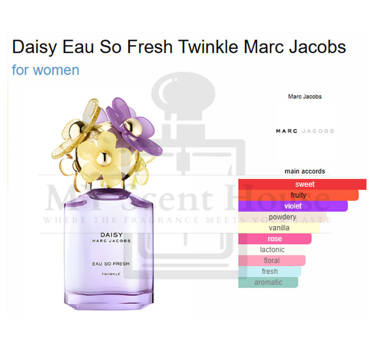 Daisy Eau So Fresh Twinkle by Marc Jacobs is a Floral Fruity fragrance for women. Daisy Eau So Fresh Twinkle was launched in 2017. Top note is Raspberry; middle notes are Violet and Wild Rose; base notes are Whipped Cream and Cassis.