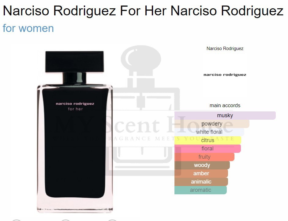 Narciso Rodriguez For Her by Narciso Rodriguez is a Floral Woody Musk fragrance for women. Narciso Rodriguez For Her was launched in 2003. Narciso Rodriguez For Her was created by Christine Nagel and Francis Kurkdjian. Top notes are African Orange Flower, Osmanthus and Bergamot; middle notes are Musk and Amber; base notes are Vetiver, Patchouli and Vanille. This perfume is the winner of 2 awards: FiFi Award Fragrance Of The Year Women`s Nouveau Niche 2004 and FiFi Award Fragrance Of The Year Women`s Nouveau Niche 2007.