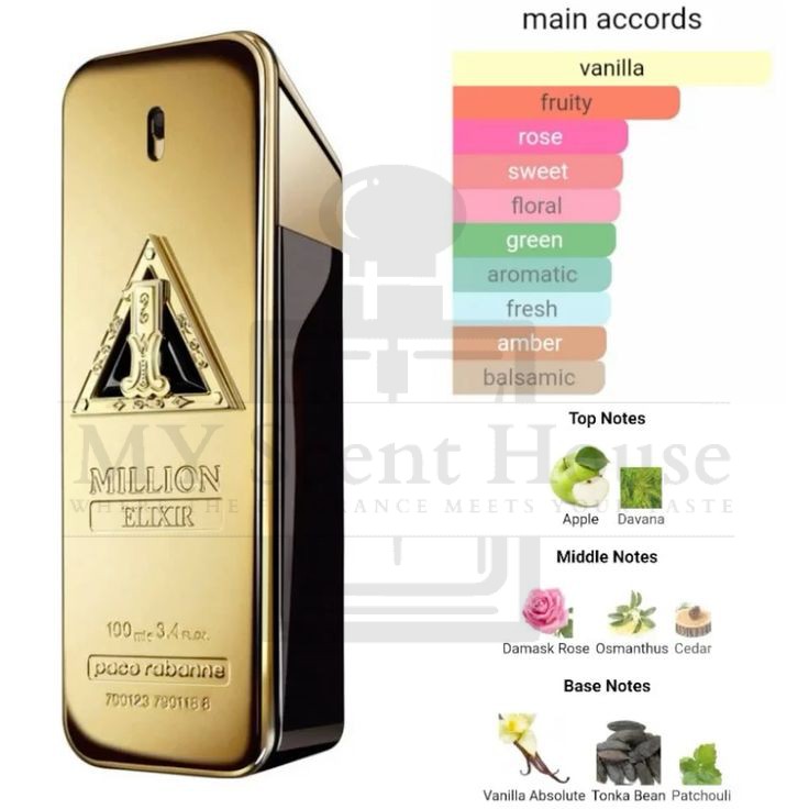 1 Million Elixir by Rabanne is a Woody Aromatic fragrance for men. 1 Million Elixir was launched in 2022. Top notes are Apple and Davana; middle notes are Damask Rose, Cedar and Osmanthus; base notes are Vanilla Absolute, Tonka Bean and Patchouli.
