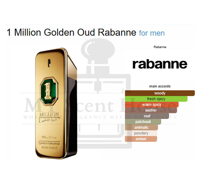 1 Million Golden Oud by Rabanne is a Leather fragrance for men. This is a new fragrance. 1 Million Golden Oud was launched in 2023. The nose behind this fragrance is Christophe Raynaud. Top notes are Saffron, Nutmeg, Black Pepper and Bergamot; middle notes are Patchouli, Gurjan balsam and Sandalwood; base notes are Leather, Oud, Cedarwood and Labdanum.