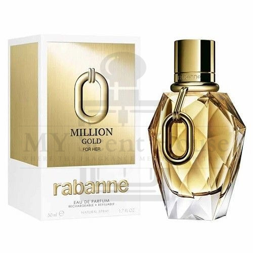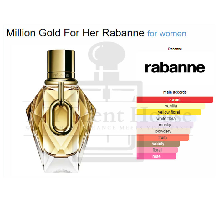Million Gold For Her by Rabanne is a Floral Woody Musk fragrance for women. This is a new fragrance. Million Gold For Her was launched in 2024. Million Gold For Her was created by Suzy Le Helley, Alienor Massenet, Loc Dong and Nathalie Benareau. Top notes are Pear, Rose and Lavender; middle notes are Ylang Ylang and Jasmine; base notes are Vanilla, Musk and Moss.