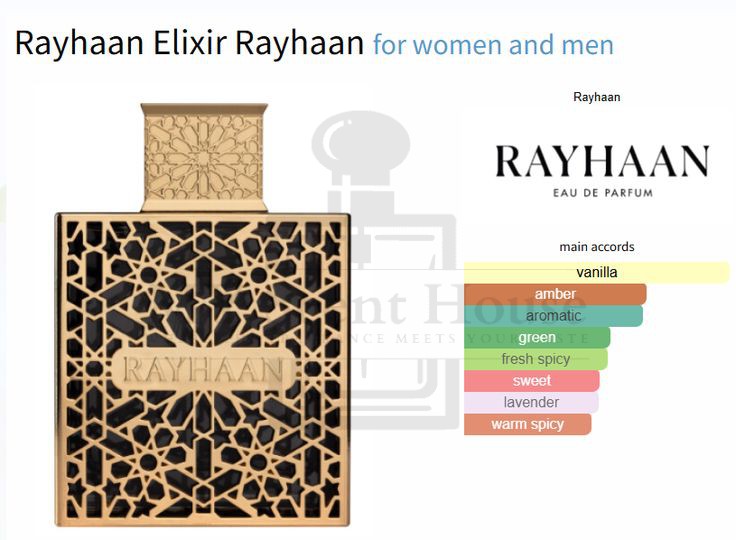 Rayhaan Elixir by Rayhaan is a Oriental Woody fragrance for women and men. This is a new fragrance. Rayhaan Elixir was launched in 2024. Top notes are Mint and Bergamot; middle notes are Lavender and Benzoin; base notes are Vanilla and Tonka.