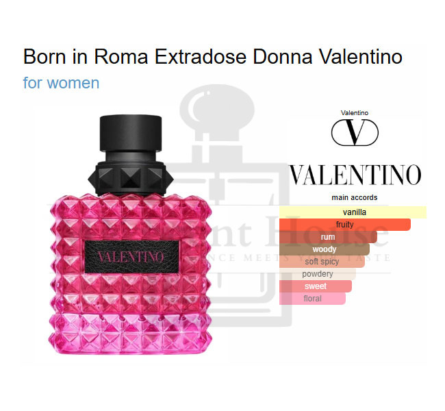 Born in Roma Extradose Donna by Valentino is a Oriental Vanilla fragrance for women. This is a new fragrance. Born in Roma Extradose Donna was launched in 2025. Top note is Blackcurrant; middle note is Rum; base note is Vanilla