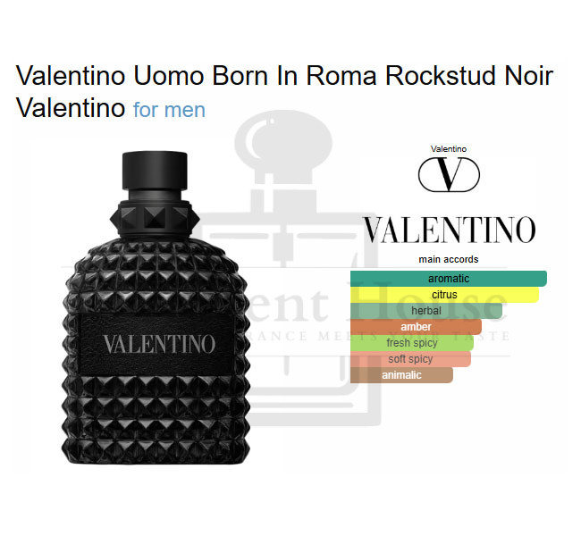 Valentino Uomo Born In Roma Rockstud Noir by Valentino is a Aromatic Fougere fragrance for men. This is a new fragrance. Valentino Uomo Born In Roma Rockstud Noir was launched in 2023. Top note is Bergamot; middle note is Sage; base note is Ambergris.