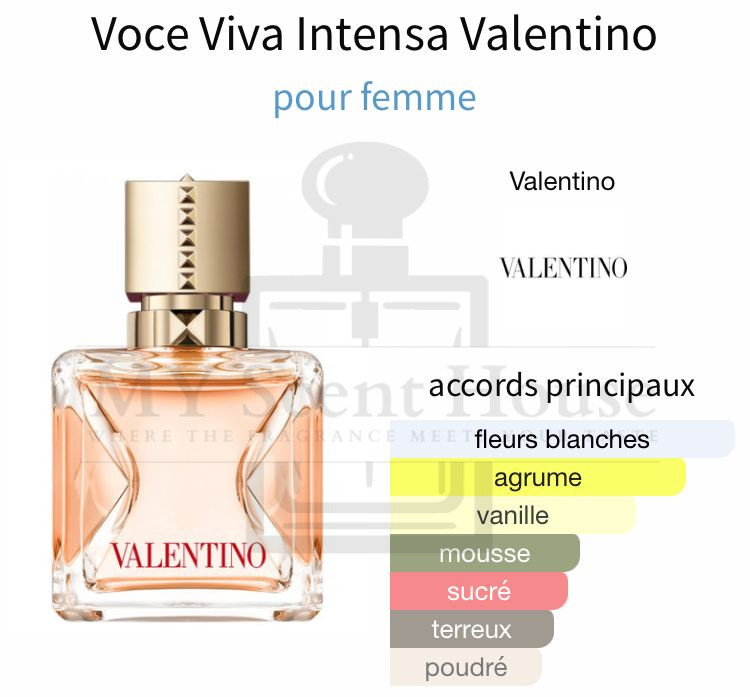 Voce Viva Intensa by Valentino is a Oriental Floral fragrance for women. Voce Viva Intensa was launched in 2021. Top notes are Mandarin Orange and Bergamot; middle notes are Orange Blossom and Jasmine Sambac; base notes are Bourbon Vanilla and Moss.