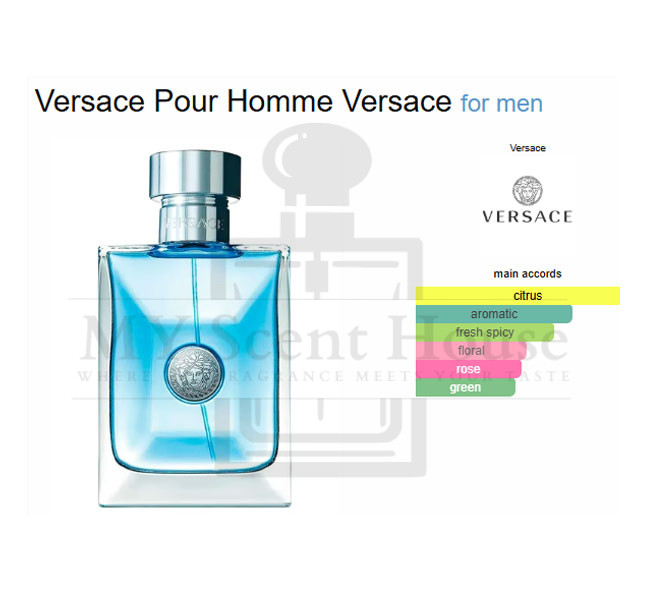 Versace Pour Homme by Versace is a Aromatic Fougere fragrance for men. Versace Pour Homme was launched in 2008. The nose behind this fragrance is Alberto Morillas. Top notes are Lemon, Bergamot, Neroli and Rose de Mai; middle notes are Hyacinth, Cedar, Clary Sage and Geranium; base notes are Musk, Tonka Bean and Amber.